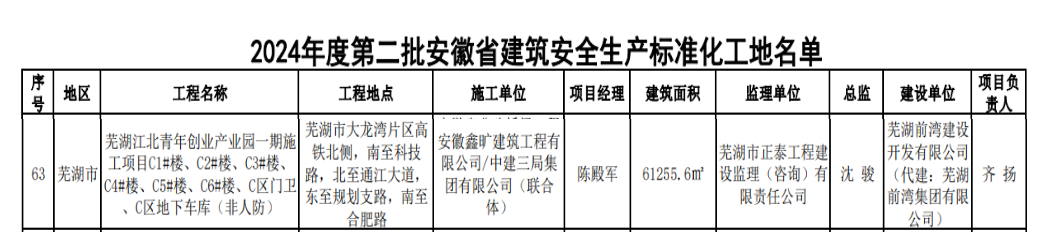 2024年8月28日,安徽省建設(shè)工程質(zhì)量與安全協(xié)會(huì)公布2024年度第二批安徽省建筑安全生產(chǎn)標(biāo)準(zhǔn)化工地名單,由前灣集團(tuán)投資開發(fā)建設(shè)的蕪湖江北青年創(chuàng)業(yè)產(chǎn)業(yè)園一期項(xiàng)目榮獲“安徽省建筑安全生產(chǎn)標(biāo)準(zhǔn)化示范工地”稱號(hào)。
