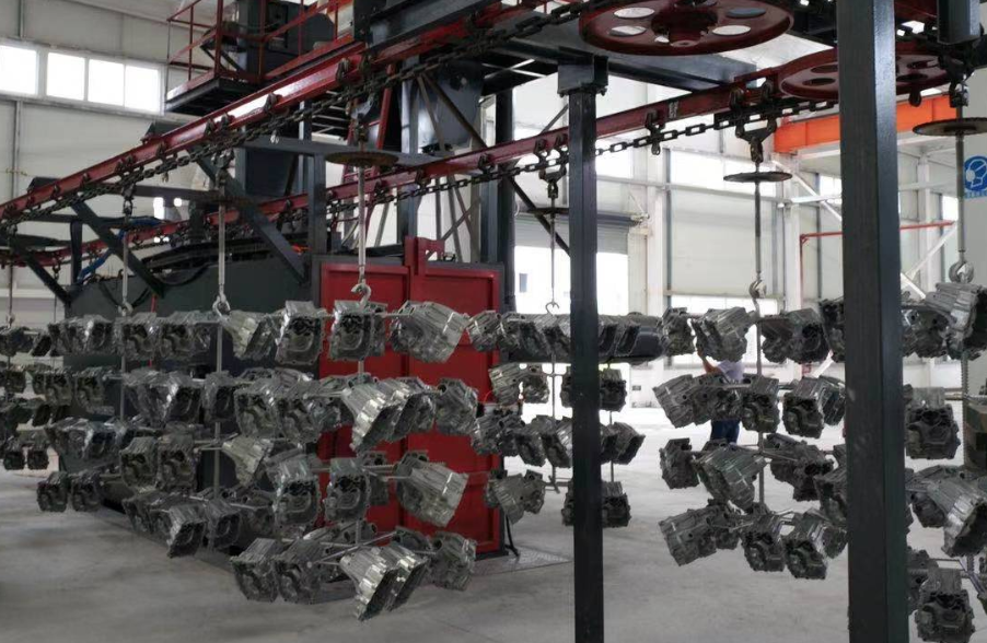 其工作原理是工件隨吊鏈可連續(xù)運(yùn)行、步進(jìn)運(yùn)行或采用先進(jìn)的積放推式懸鏈輸送工件,使工件在裝卸料以及拋丸區(qū)分別處于停止?fàn)顟B(tài),實(shí)現(xiàn)定點(diǎn)裝卸和定點(diǎn)拋丸工序,根據(jù)工件不同可單點(diǎn)吊重50~2000kg,且生產(chǎn)率高,運(yùn)行可靠,對各類易吊掛類零件的大批量清理,非常適用。