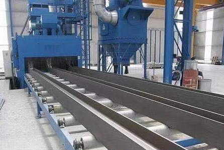 鋼結(jié)構(gòu)拋丸清理機(jī)系列產(chǎn)品是針對(duì)型鋼和焊接鋼結(jié)構(gòu)件在涂漆前完成拋丸清理達(dá)到鋼材預(yù)處理標(biāo)準(zhǔn)而設(shè)計(jì)制造的專用設(shè)備。該系列機(jī)采用輥道通過式方式設(shè)計(jì),主要結(jié)構(gòu)包括:清理室體、輥道系統(tǒng)、彈丸循環(huán)系統(tǒng)、拋丸器、尾吹系統(tǒng)、氣動(dòng)系統(tǒng)、電氣系統(tǒng)和除塵系統(tǒng)。輥道承載工件經(jīng)輸入輥道運(yùn)至拋丸清理室,多臺(tái)拋丸器運(yùn)轉(zhuǎn)加速彈丸轟擊工件表面,有效地去除工件表面銹蝕、氧化皮、焊渣,獲得一定粗糙度及表面壓應(yīng)力的金屬本色表面,以提高涂漆附著力并延長鋼結(jié)構(gòu)件的使用壽命,達(dá)到拋丸清理的目的。
