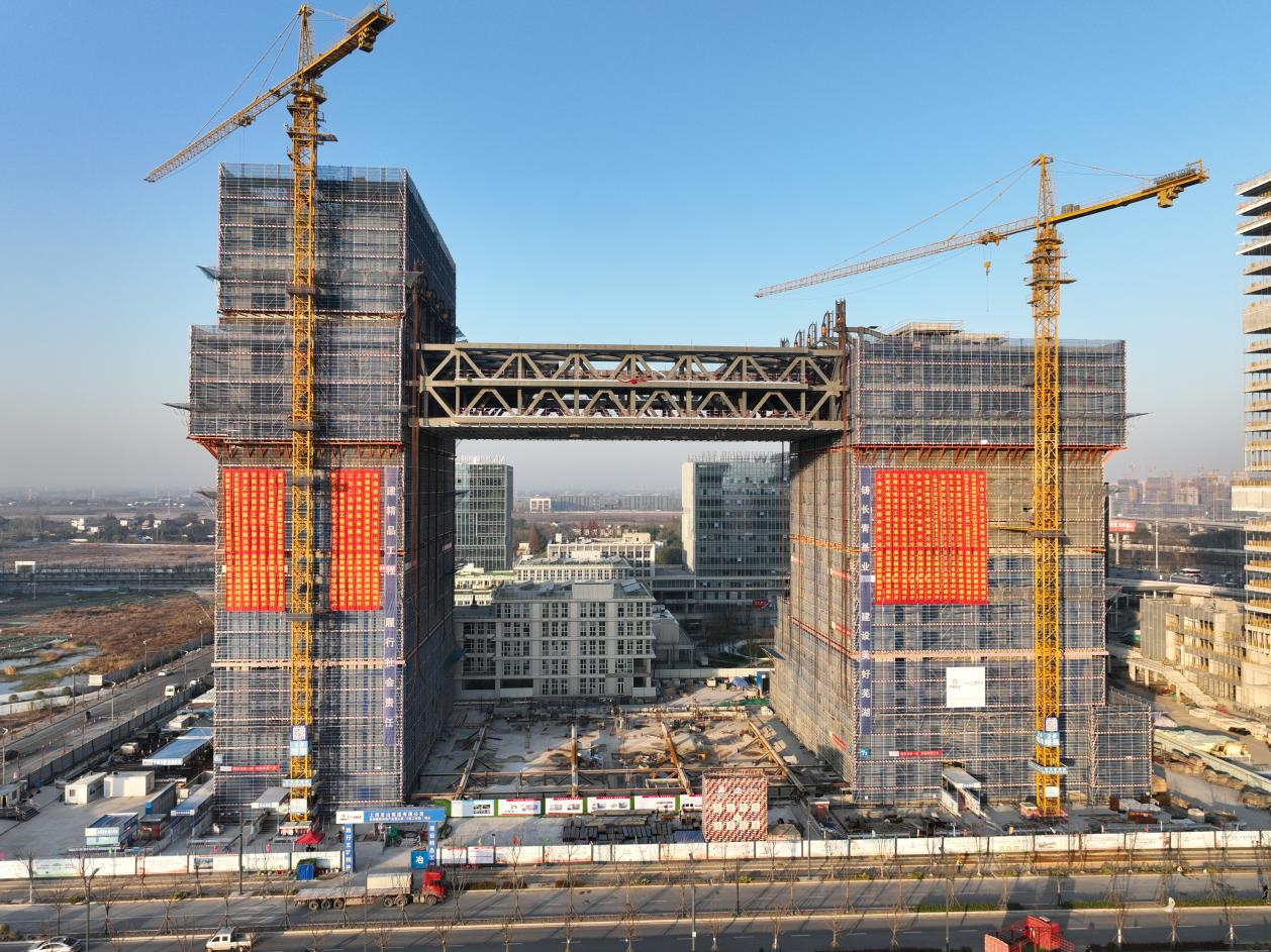 12 月 15 日 17 時(shí),歷經(jīng) 81 個(gè)小時(shí)的緊張施工,一座重達(dá) 3845 噸的雙層鋼桁架空中連廊成功整體“爬升”至 67 米高空,將兩座塔樓連為一體,正式標(biāo)志該項(xiàng)目主體結(jié)構(gòu)工程基本完成。