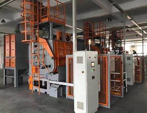 6、拋丸機的工作流程:首先把需拋丸的工件或鋼材吊入通過式拋丸機輥道上(必須確保吊入通過式拋丸機輥道上的工件或鋼材不會傾倒卡死)→啟動輥道電機輸送工件或鋼材→當(dāng)工件或鋼材進入拋丸機室時啟動拋丸機室內(nèi)的各個方向的噴頭電機對工件或鋼材進行拋丸除銹(啟動噴頭電機的數(shù)量要根據(jù)工件或鋼材拋丸除銹的實際效果選擇全啟動或部分啟動)→工件或鋼材出拋丸機室后關(guān)閉噴頭電機→通過式拋丸機出口輥道工件或鋼材全部拋丸機室后關(guān)閉輥道輸送電機→啟用吊車吊離出口輥道上的工件或鋼材進行清理噴漆工作。